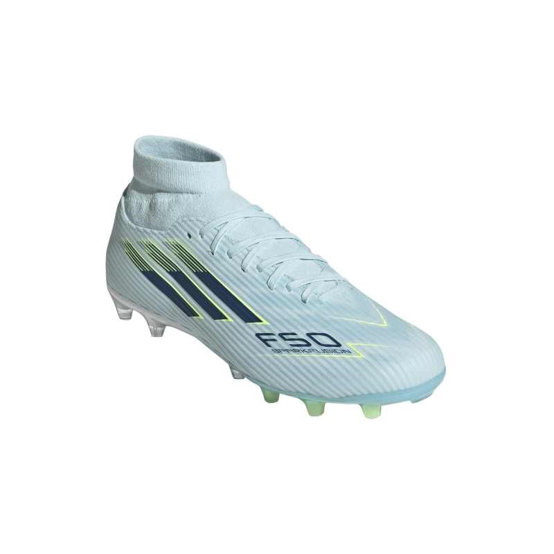 The F50 Sparkfusion League Mid Cut Firm Ground / Artificial Ground Soccer Cleats are crafted for those who dare to redefine their games. Fusionlast technology provides a lower instep, narrower heel, and optimized toebox volume for a snug fit. The midcut knit collar molds to your foot, offering comfort and support. The Fiberskin Upper, with its engineered mesh package and strategically placed 3D lines, aids ball touch. Equipped with Sprintplate Fusion, these cleats feature a TPU-based outsole designed for traction and comfort. Semiconical studs allow for ease of rotation and push-off support on natural and artificial grass pitches, while the 360-degree rotation zone is crafted for fast change of direction. The iconic 3-Stripes branding and the F50 logo add the finishing touch to this pair. Blending performance and style, these adidas cleats make a smart addition to your gear.